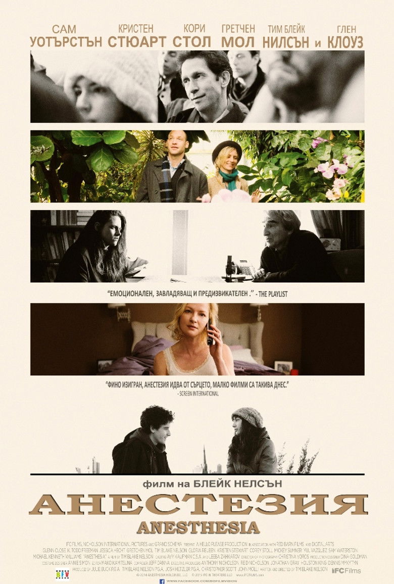 2016 Anesthesia Multiple lives intersect in the aftermath of the violent mugging of a Columbia University philosophy professor. Credits Director Tim Blake Nelson Producers Tim Blake Nelson , Julie Buck , Christopher J. Scott Writer Tim Blake Nelson Cinematographer Christina Alexandra Voros Editor Mako Kamitsuna Production Design Dina Goldman-Kunin Composer Jeff Danna Casting Avy Kaufman Cast Glenn Close , K. Todd Freeman , Jessica Hecht , Gretchen Mol , Tim Blake Nelson , Gloria Reuben , Kristen Stewart , Corey Stoll , Mickey Sumner , Sam Waterston Studio Hello Please Genres Drama Thriller External IMDb Amazon Posters 5
