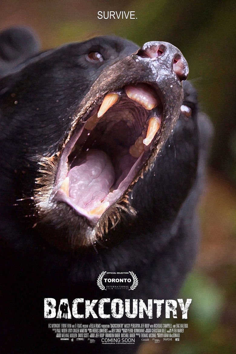 2015 Backcountry A couple on a deep-wilderness hike become hopelessly lost within an aggressive black bear's territory. Credits Director Adam MacDonald Producers Thomas Michael , Brandon Baker , Michael Baker Writer Adam MacDonald Cinematographer Christian Bielz Editor Dev Singh Production Design Pierre Bonhomme Composer Frères Lumières Casting Paul Weber Cast Missy Peregrym , Jeff Roop , Eric Balfour , Nicholas Campbell Studio Fella Films Genres Thriller Horror External IMDb Amazon Posters 5