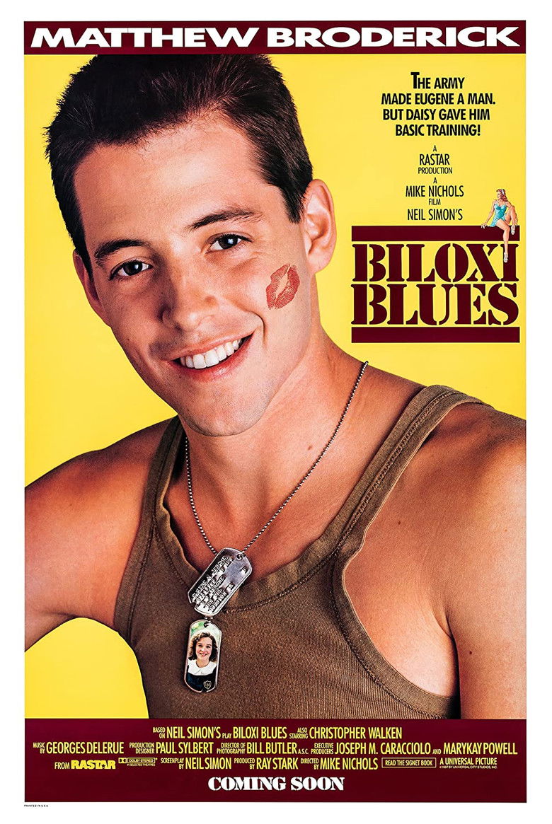 1988 Biloxi Blues A Jewish teenager sets three goals: lose his virginity, become a writer, and survive World War II. Credits Director Mike Nichols Producers Joseph M. Caracciolo , Marykay Powell , Ray Stark Writer Neil Simon Cinematographer Bill Butler Composer Georges Delerue Cast Matthew Broderick , Christopher Walken , Matt Mulhern , Corey Parker , Markus Flanagan , Casey Siemaszko , Michael Dolan , Penelope Ann Miller , Park Overall , Alan Pottinger Studios Universal Pictures , Rastar Productions Genres Drama Comedy War Posters 5 US theatrical US international US character US teaser US imax