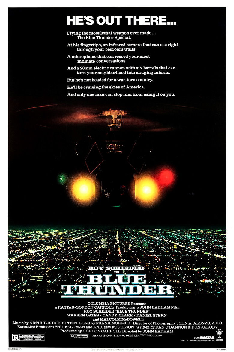 Los Angeles, California. Officer Murphy, a veteran Metropolitan Police helicopter pilot suffering from severe trauma due to his harsh experiences during the Vietnam War, and Lymangood, his resourceful new partner, are tasked with testing an advanced and heavily armed experimental chopper known as Blue Thunder.
