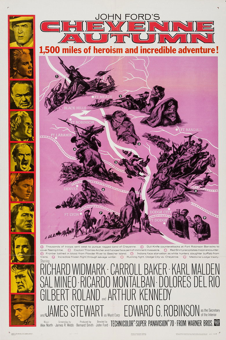 1964 Cheyenne Autumn A reluctant cavalry Captain must track a defiant tribe of migrating Cheyenne. Credits Director John Ford Producers Bernard Smith , John Ford Writer James R. Webb Cinematographer William H. Clothier Composer Alex North Cast Richard Widmark , Carroll Baker , Karl Malden , Sal Mineo , Dolores del Río , Ricardo Montalban , Gilbert Roland , Arthur Kennedy , James Stewart , Edward G. Robinson Studio Ford-Smith Productions Genre Western Posters 5 US theatrical US international US character US teaser US imax