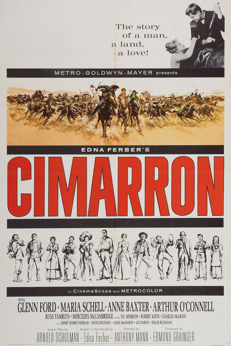 1960 Cimarron The epic story of a family involved in the Oklahoma Land Rush of April 22, 1889. Credits Director Anthony Mann Producer Edmund Grainger Writer Arnold Schulman Cinematographer Robert Surtees Composer Franz Waxman Cast Glenn Ford , Maria Schell , Anne Baxter , Arthur O'Connell , Russ Tamblyn , Mercedes McCambridge , Vic Morrow , Robert Keith , Charles McGraw , Harry Morgan Studio Metro-Goldwyn-Mayer Genre Western Posters 5 US theatrical US international US character US teaser US imax
