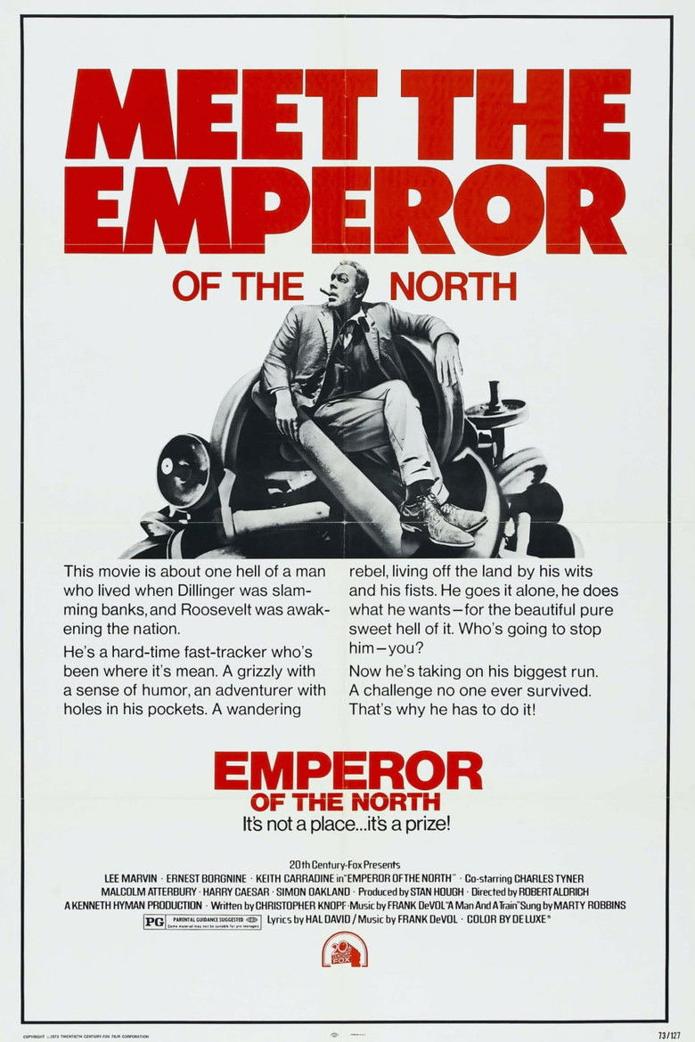1973 Emperor of the North Hobos encounter a sadistic railway conductor that will not let anyone "ride the rails" for free. Credits Director Robert Aldrich Producers Stanley Hough , Kenneth Hyman Writers Jack London , Christopher Knopf Cinematographer Joseph F. Biroc Composer Frank De Vol Cast Lee Marvin , Ernest Borgnine , Keith Carradine , Charles Tyner , Malcolm Atterbury , Simon Oakland , Harry Caesar , Hal Baylor , Matt Clark , Elisha Cook Jr. Studios 20th Century Fox , Inter Hemisphere Genres Drama Thriller Action Adventure Posters 5 US theatrical US international US character US teaser US imax