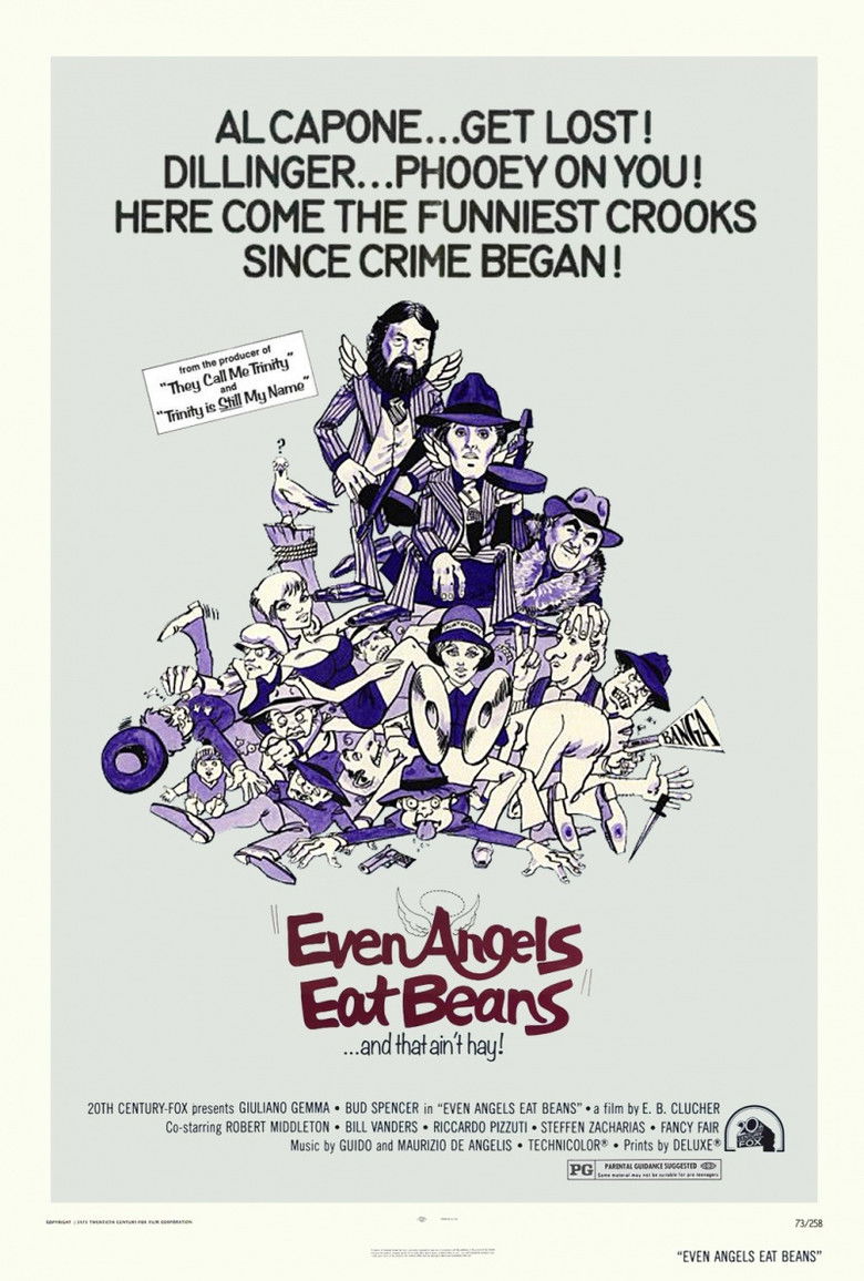 1973 Even Angels Eat Beans Two mismatched buddies are mistaken for mob enforcers in Depression-era America. Credits Director Enzo Barboni Producers Antonio Morelli , Thomas Sagone Writers Ángel G. Gauna , Marie Claire Solleville , Tulio Demicheli , Enzo Barboni , J. Fortini Cinematographer Francisco Marín Composers Guido De Angelis , Maurizio De Angelis Cast Giuliano Gemma , Bud Spencer , Robert Middleton , Bill Vanders , Riccardo Pizzuti , Lara Sender , Steffen Zacharias , Francy Fair , Claudio Ruffini , George Rigaud Studios Tritone Cinematografica , Les Productions Fox Europa , Mundial Film Genres Crime Comedy Action Posters 5 US theatrical US international US character US teaser US imax