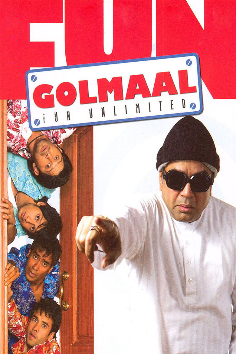2006 Golmaal – Fun Unlimited Four runaway cons take shelter in a bungalow owned by an old blind couple. Credits Director Rohit Shetty Producer Dhilin Mehta Writer Neeraj Vora Cinematographer Aseem Bajaj Composers Shekhar Ravjiani , Sanjoy Chowdhury , Vishal Dadlani Cast Ajay Devgn , Arshad Warsi , Sharman Joshi , Tusshar Kapoor , Paresh Rawal , Sushmita Mukherjee , Rimi Sen , Mukesh Tiwari , Vrajesh Hirjee , Sanjay Mishra Studios Shree Ashtavinayak Cinevision Ltd , K Sera Sera Limited Genres Comedy Family Posters 3 US theatrical US international US character