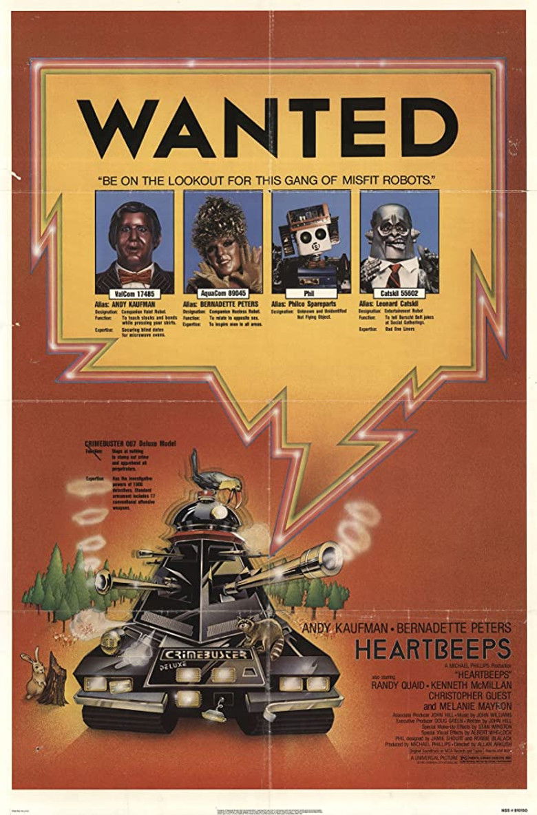 1981 Heartbeeps Two domestic robots fall in love and run off together. Credits Director Allan Arkush Cast Andy Kaufman , Bernadette Peters , Randy Quaid , Kenneth McMillan , Christopher Guest , Melanie Mayron , Richard B. Shull , Dick Miller , Kathleen Freeman , Mary Woronov Studio Universal Pictures Genres Romance Comedy Family External IMDb Posters 5 US theatrical US international US character US teaser US imax