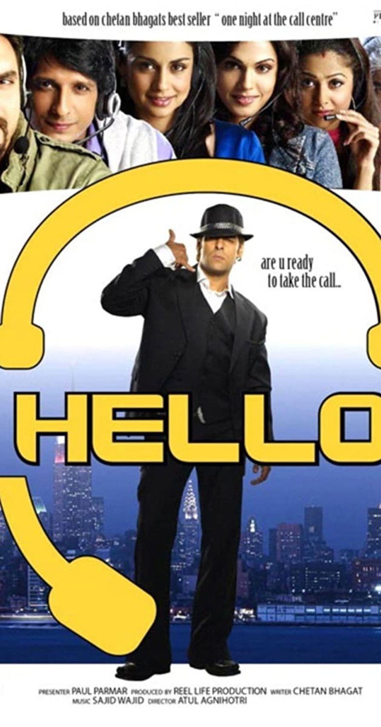 2008 Hello Call-center workers receive a phone call from God. Credits Director Atul Agnihotri Producers Paul Parmar , Atul Agnihotri Writers Atul Agnihotri , Alok Upadhyay Cinematographer Sanjay F. Gupta Editor Umesh Gupta Production Design Muneesh Sappel Composers Sajid Ali Khan , Wajid Khan Visual Effects Sandeep Kamal Cast Sharman Joshi , Sohail Khan , Isha Koppikar , Gul Panag , Amrita Arora , Sharat Saxena , Dalip Tahil , Suresh Menon , Shashi Kiran , Salman Khan Studios Reel Life Productions , Funky Buddha Media , Mirah Entertainment , Perception Pictures Genre Comedy External IMDb Amazon Posters 3