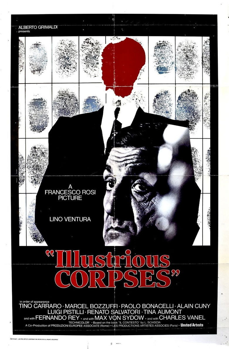 1976 Illustrious Corpses A detective is assigned to investigate the mysterious murders of some Supreme Court judges. Credits Director Francesco Rosi Producer Alberto Grimaldi Writers Francesco Rosi , Tonino Guerra , Lino Iannuzzi Cinematographer Pasqualino De Santis Composer Piero Piccioni Cast Lino Ventura , Tino Carraro , Marcel Bozzuffi , Paolo Bonacelli , Alain Cuny , Maria Carta , Luigi Pistilli , Tina Aumont , Renato Salvatori , Paolo Graziosi Studios PEA , Les Productions Artistes AssociƩs Genre Thriller Posters 5 US theatrical US international US character US teaser US imax