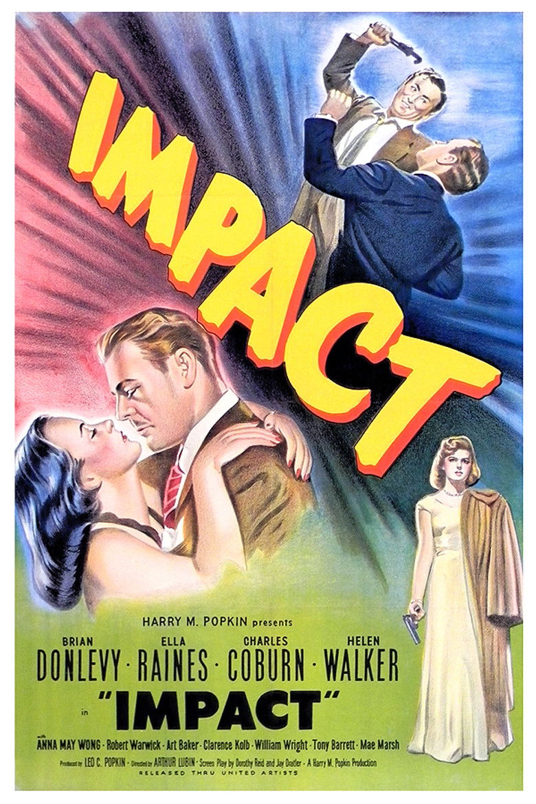 1949 Impact After surviving a murder attempt, an auto magnate goes into hiding so his wife can pay for the crime. Credits Director Arthur Lubin Producers Leo C. Popkin , Harry M. Popkin Writers Jay Dratler , Dorothy Davenport Cinematographer Ernest Laszlo Editor Arthur H. Nadel Costume Design Maria P. Donovan Composer Michel Michelet Cast Brian Donlevy , Ella Raines , Charles Coburn , Helen Walker , Anna May Wong , Robert Warwick , Clarence Kolb , Art Baker , William Wright , Mae Marsh Studio Cardinal Pictures Genres Drama Thriller Mystery External IMDb Amazon Posters 5