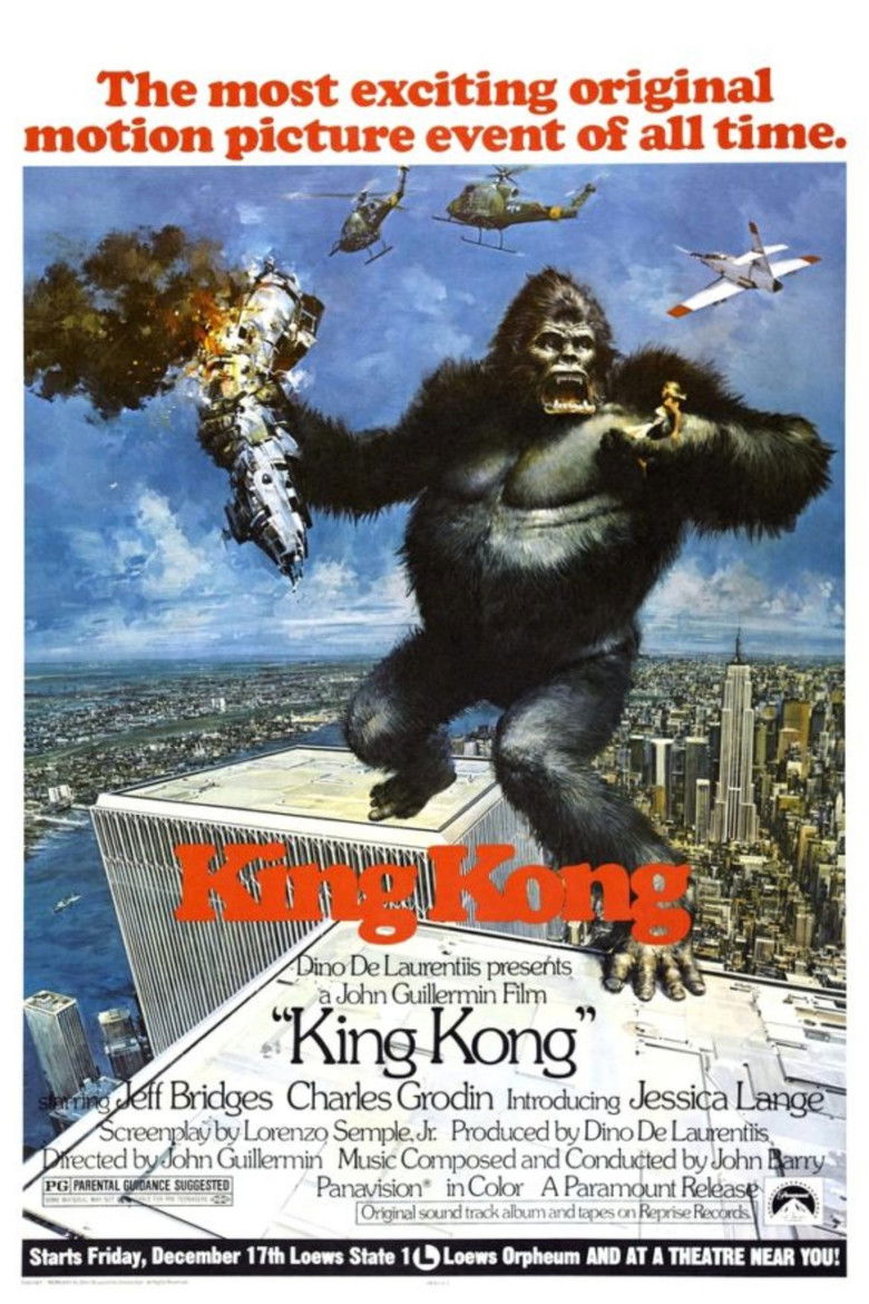 1976 King Kong An oil company expedition disturbs the peace of a giant ape and brings him back to New York to exploit him. Credits Director John Guillermin Producers Federico De Laurentiis , Christian Ferry , Dino De Laurentiis Writers Lorenzo Semple Jr. , James Ashmore Creelman , Ruth Rose Cinematographer Richard H. Kline Composer John Barry Cast Jeff Bridges , Jessica Lange , Charles Grodin , John Randolph , René Auberjonois , Julius Harris , Jack O'Halloran , Ed Lauter , John Agar , Jorge Moreno Studio The De Laurentiis Company Genres Fantasy Adventure External IMDb Posters 5 US theatrical US international US character US teaser US imax