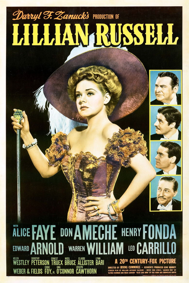 1940 Lillian Russell Alice Faye plays the title role in this 1940 film biography of the early-20th-century stage star. Credits Director Irving Cummings Cast Alice Faye , Don Ameche , Henry Fonda , Edward Arnold , Warren William , Leo Carrillo , Helen Westley , Nigel Bruce , Lynn Bari , Claud Allister Studio 20th Century Fox Genres Drama Music External IMDb Posters 5 US theatrical US international US character US teaser US imax