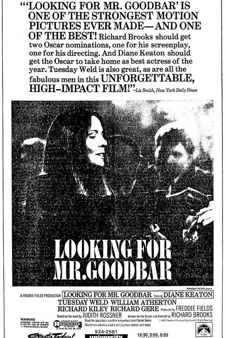 A short, unhappy affair with a married man leads a dedicated schoolteacher into the alcohol-and-drug fueled underworld of singles’ bars, where she begins to engage in a pattern of dangerous sexual activity.