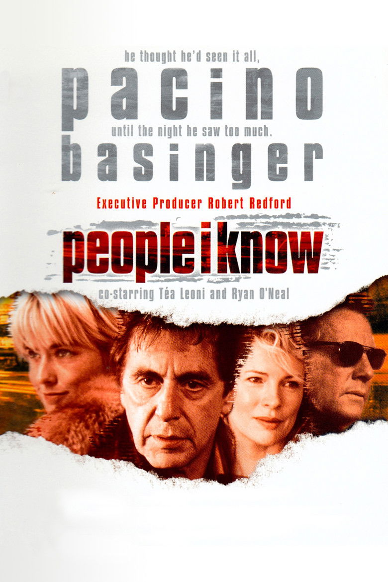 2002 People I Know A New York press agent must scramble when his major client becomes embroiled in a huge scandal. Credits Director Daniel Algrant Producer Michael Nozik Writer Jon Robin Baitz Cinematographer Peter Deming Composer Terence Blanchard Cast Al Pacino , Kim Basinger , Ryan O'Neal , Téa Leoni , Richard Schiff , Bill Nunn , Robert Klein , Mark Webber , Eldon Bullock , Juliet Papa Studios Myriad Pictures , Wildwood Enterprises , GreeneStreet Films , Galena , Chal Productions , In-Motion AG Movie & TV Productions Genres Drama Thriller Posters 5 US theatrical US international US character US teaser US imax