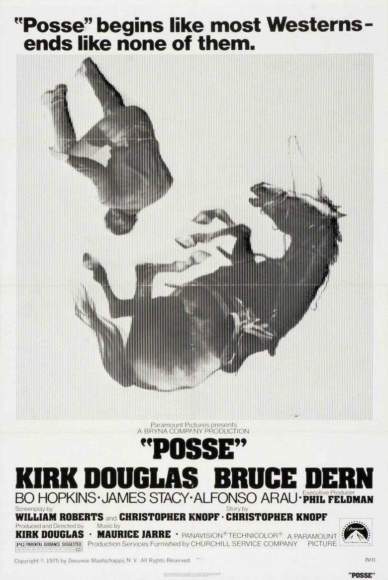 1975 Posse A tough marshal with political ambitions leads an elite posse to capture a notorious train robber and his gang. Credits Director Kirk Douglas Producer Kirk Douglas Writers Christopher Knopf , William Roberts Cinematographer Fred J. Koenekamp Composer Maurice Jarre Cast Kirk Douglas , Bruce Dern , Bo Hopkins , James Stacy , Luke Askew , David Canary , Alfonso Arau , Katherine Woodville , Mark Roberts , Beth Brickell Studios Paramount Pictures , Bryna Productions Genre Western External IMDb Posters 5 US theatrical US international US character US teaser US imax