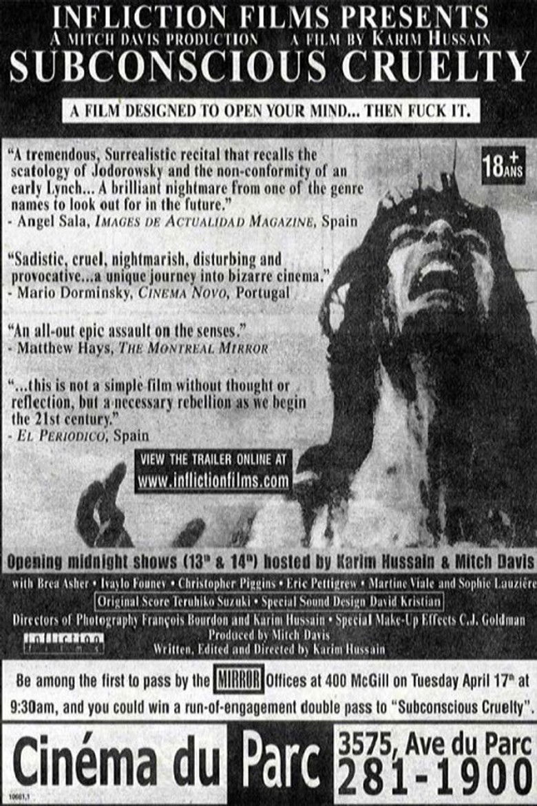 2001 Subconscious Cruelty A surrealistic anthology of horror films; four segments structured as an intense fever dream... Credits Director Karim Hussain Producer Mitch Davis Writer Karim Hussain Cinematographer Karim Hussain Cast Mitch Davis , Christopher Piggins , Sophie Lauzière , Anne-Marie Belley , Brea Asher , Ivaylo Founev , Eric Levasseur , Janis Higgins , Nadia Simaani , Anna Berlyn Studio Infliction Films Genres Crime Horror Posters 5 US theatrical US international US character US teaser US imax