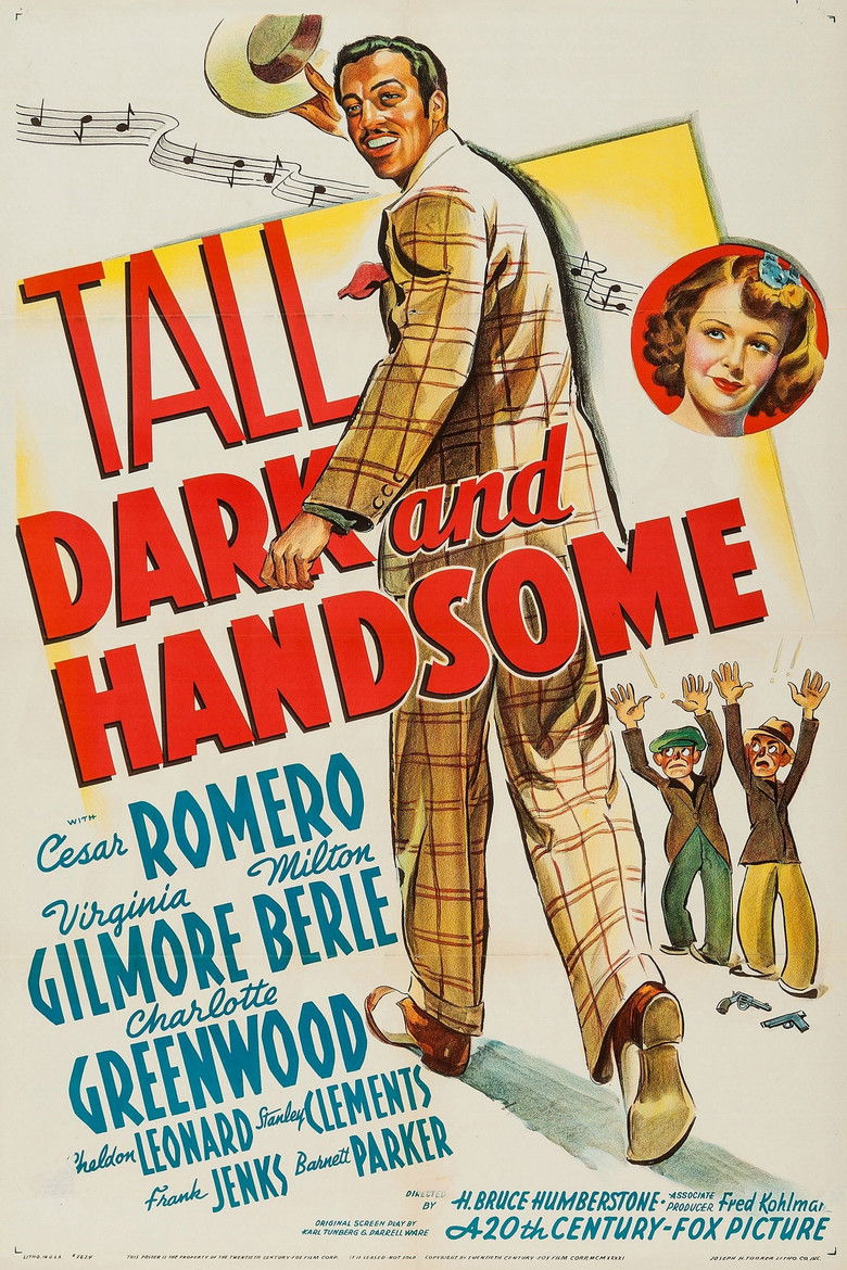 1941 Tall, Dark and Handsome Robin Hoodish gangster in 1929 Chicago is an object of affection, kind to New York hood and bad to a bad crook. Credits Director H. Bruce Humberstone Cast Cesar Romero , Virginia Gilmore , Milton Berle , Charlotte Greenwood , Sheldon Leonard , Stanley Clements , Frank Jenks , Barnett Parker , Marc Lawrence , Paul Hurst Studio 20th Century Fox Genres Crime Comedy External IMDb Posters 4 US theatrical US international US character US teaser