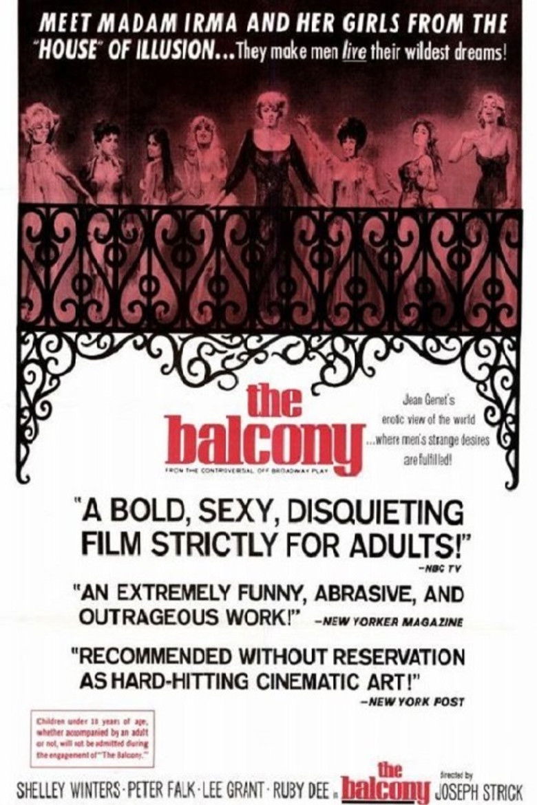 1963 The Balcony The Madam of a brothel satisfies the erotic fantasies of her customers, while a revolution is sweeping the nation. Credits Director Joseph Strick Cast Shelley Winters , Peter Falk , Lee Grant , Peter Brocco , Joyce Jameson , Jeff Corey , Arnette Jens , Ruby Dee , Leonard Nimoy , Kent Smith Studios City Film , Allen-Hodgdon Productions , Walter Reade-Sterling Genres Drama Fantasy Comedy External IMDb Posters 5 US theatrical US international US character US teaser US imax