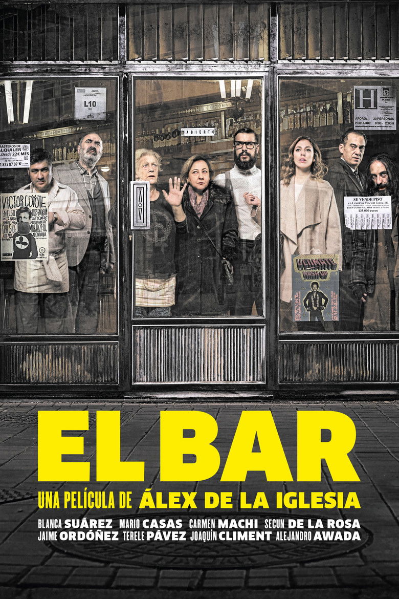 2017 The Bar In downtown Madrid, a series of mysterious gunshots trap a motley assortment of people in a decrepit bar. Credits Director Álex de la Iglesia Producers Carolina Bang , Mikel Lejarza , Álex de la Iglesia Writers Álex de la Iglesia , Jorge Guerricaechevarría Cinematographer Ángel Amorós Editor Domingo González Costume Design Paola Torres Composers Carlos Riera , Joan Valent Casting Pilar Moya Cast Blanca Suárez , Mario Casas , Carmen Machi , Secun de la Rosa , Jaime Ordóñez , Terele Pávez , Alejandro Awada , Tony Lam , Sue Flack , Daniele Fileti Studios Pampa Films , Pokeepsie Films , Nadie es Perfecto Genres Thriller Comedy Horror External IMDb Amazon Posters 5