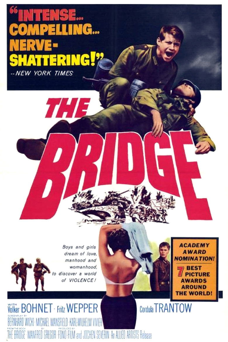 A group of German boys are ordered to protect a small bridge in their home village during the waning months of the second world war. Truckloads of defeated, cynical Wehrmacht soldiers flee the approaching American troops, but the boys, full of enthusiasm for the "blood and honor" Nazi ideology, stay to defend the useless bridge. The film is based on a West German anti-war novel of the same name, written by Gregor Dorfmeister.