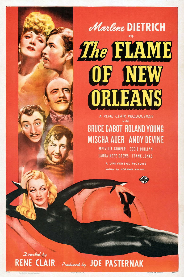 1941 The Flame of New Orleans In old New Orleans, a beautiful adventuress juggles the attentions of a rich banker and a dashing sea captain. Credits Director René Clair Cast Marlene Dietrich , Bruce Cabot , Roland Young , Theresa Harris , Mischa Auer , Andy Devine , Frank Jenks , Eddie Quillan , Laura Hope Crews , Franklin Pangborn Studio Universal Pictures Genres Romance Comedy External IMDb Posters 5 US theatrical US international US character US teaser US imax