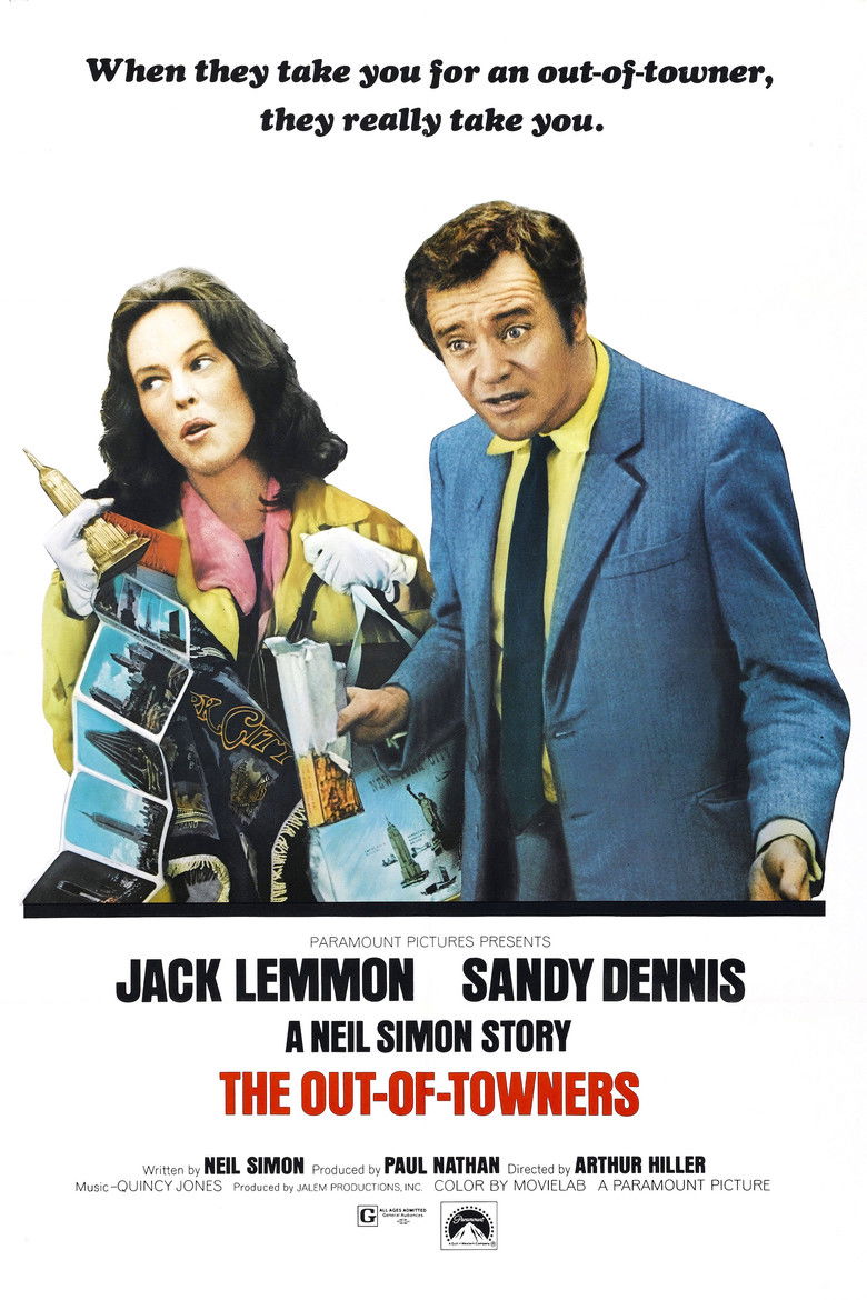 1970 The Out-of-Towners A trip to New York for a job interview turns into a trip to hell for a small town couple. Credits Director Arthur Hiller Producer Paul Nathan Writer Neil Simon Cinematographer Andrew Laszlo Composer Quincy Jones Cast Jack Lemmon , Sandy Dennis , Sandy Baron , Anne Meara , Robert Nichols , Ann Prentiss , Ron Carey , Philip Bruns , Graham Jarvis , Carlos Montalbán Studios Paramount Pictures , Jalem Productions Genre Comedy Posters 5 US theatrical US international US character US teaser US imax