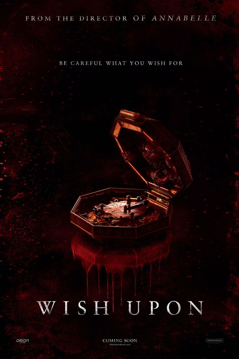 2017 Wish Upon A teenage girl discovers a box with magical powers, but those powers comes with a deadly price. Credits Director John R. Leonetti Producers Sherryl Clark , Daniel Hammond , Gabriel Hammond Writer Barbara Marshall Cinematographer Michael Galbraith Editor Peck Prior Production Design Bob Ziembicki Costume Design Antoinette Messam Composers Andy Milburn , Tom Hajdu Visual Effectss Anthony Paterson , Arthur J. Codron Castings Mary Vernieu , Michelle Wade Byrd Cast Joey King , Ki Hong Lee , Sydney Park , Shannon Purser , Sherilyn Fenn , Elisabeth Röhm , Ryan Phillippe , Mitchell Slaggert , Josephine Langford , Alice Lee Studios Orion Pictures , Busted Shark Productions , Broad Green Pictures Genres Thriller Fantasy Horror External IMDb Amazon Posters 5