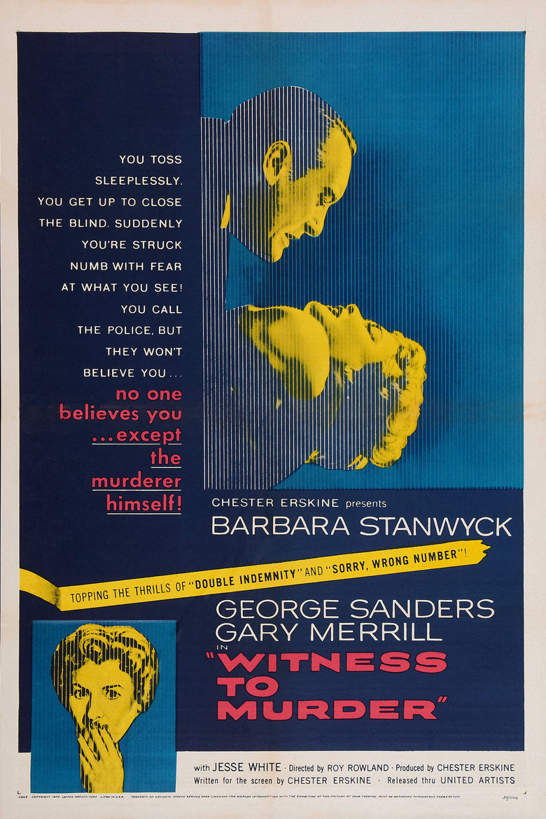 1954 Witness to Murder A woman fights to convince the police that she witnessed a murder while looking out her bedroom window. Credits Director Roy Rowland Writer Chester Erskine Cinematographer John Alton Cast Barbara Stanwyck , George Sanders , Gary Merrill , Jesse White , Harry Shannon , Claire Carleton , Lewis Martin , Dick Elliott , Harry Tyler , Juanita Moore Studios United Artists , Chester Erskine Productions Genres Drama Crime Thriller Posters 5 US theatrical US international US character US teaser US imax